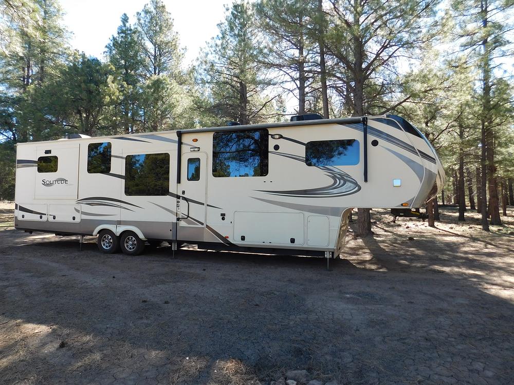 Affordable Luxury Extended Stay Vehicle If more room is what you desire, Solitude is a spacious Extended Stay Fifth Wheel. The Solitude RV delivers taller ceilings, taller, deeper cabinets, larger scenic window areas, a full 6' 8" tall slide out, and a body width that measures a full 101 inches!