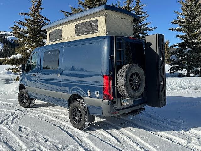 Steel Blue, R150S, Electric Pop-Top w/Bed, Isotherm 120 Refrigerator, Butcher Block counter tops, Artic panel window covers for conversion windows, Espar Airtronic D5 Furnace and Hot Water Heater, 110v/12v, Two Zamp 100W Obsidian Solar Panels, Two AGM 4D House Battery, 2000w Magnum Inverter, Exterior Shower, 16 Gallon Water Tank, Lonplate Floor, Porta Potti w/ Hassock Cover, Extreme Weather Insulation, Zippered Bug Screens Rear doors and Slider Door, Upgraded Audio package, Agile Offroad RIP Kit, Agile installed oversized fuel tank (48 gal capacity), On-Board Air Compressor with connections, Owl Vans Driver side rear ladder/Tire Carrier combo, Passenger Side Sherpa Mounting Plate with Ski Storage and Expedition Box, Custom Carpet overlay, Porch Light, 10 Awning, Upgraded Wheels & Tires, Seats 5, Sleeps 4.