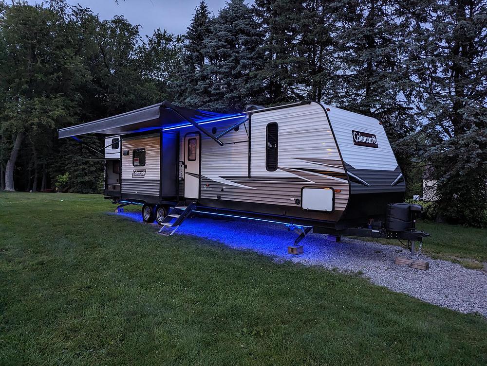 Multi-color LED lighting throughout the interior and exterior of the camper provide plenty of lighting options. Docking station includes water, cable, a hose bib, and GFCI power outlet. Power tongue jack and power stabilizing jacks make a breeze. Package will include everything to camp right away: 50ft water hose, sewer hoses, 25ft cable line, and upgraded 50amp power cord.