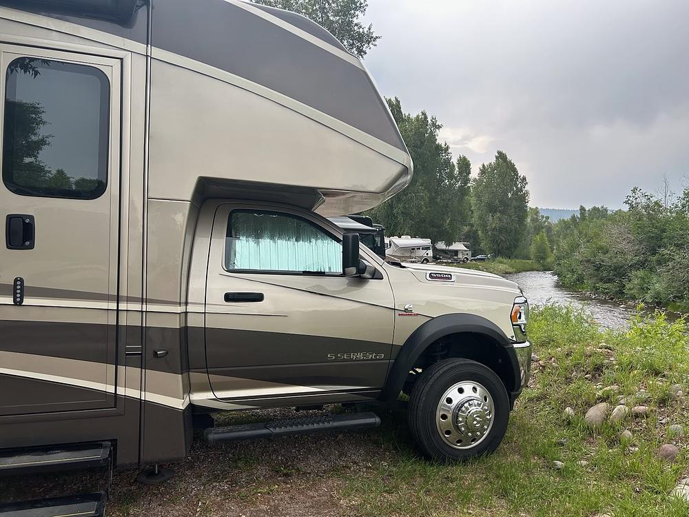 The Isata 5 Series Class C Motorhome pairs luxury living with a powerful Cummins diesel and best in class towing. You no longer need choose who or what gets left behind. This RV has seatbelts for 2 up front and 3 in the coach. You will travel in a familiar and extremely comfortable truck cab and you will find yourself inventing reasons for just one more trip.