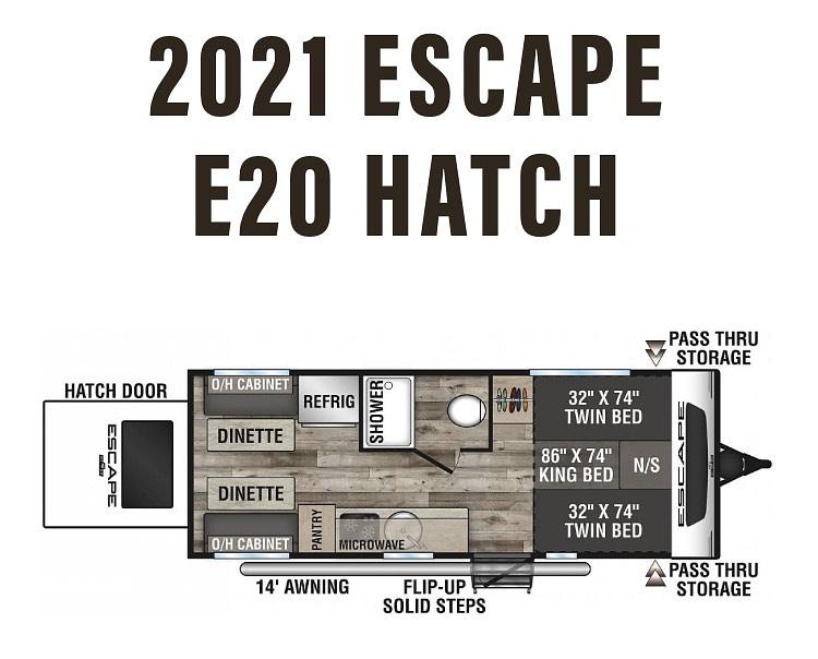 2021 E20 Escape Hatch. Hatch allows for transporting bikes, kayaks etc. Easily pulls with a half ton pickup.