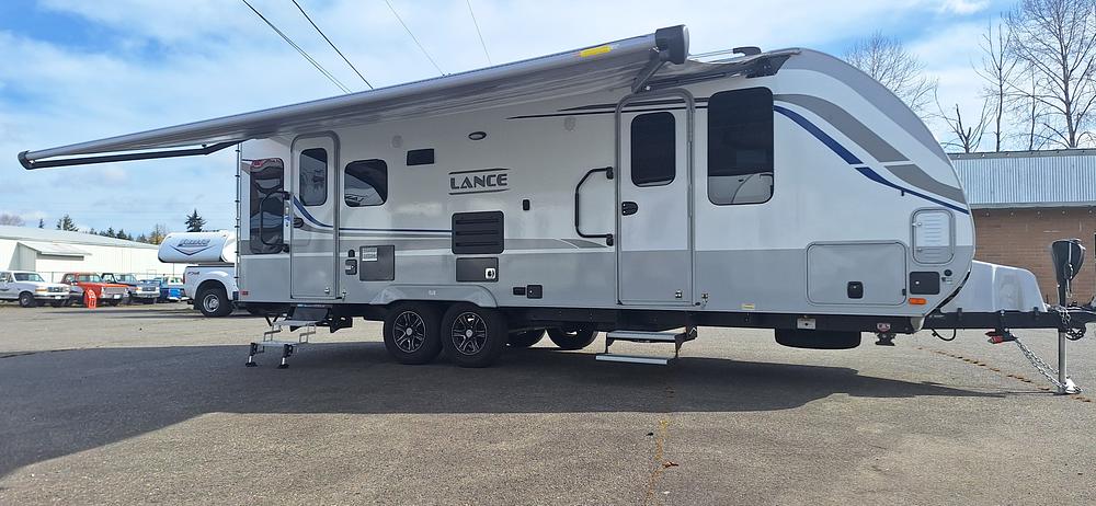 Excellent Condition!! 2021 Lance 2375 is a premium 28-foot lightweight travel trailer, featuring a rear lounge layout with rocker swivel chairs, a walk-around queen bed, one slide-out, and a spacious mid-bathroom. Built with aluminum-framed, Azdel composite construction, this four-season trailer is designed with high quality craftmanship, materials and durability. It has a dry weight of approximately 5,700 lbs and is suitable for ½ ton pickups!