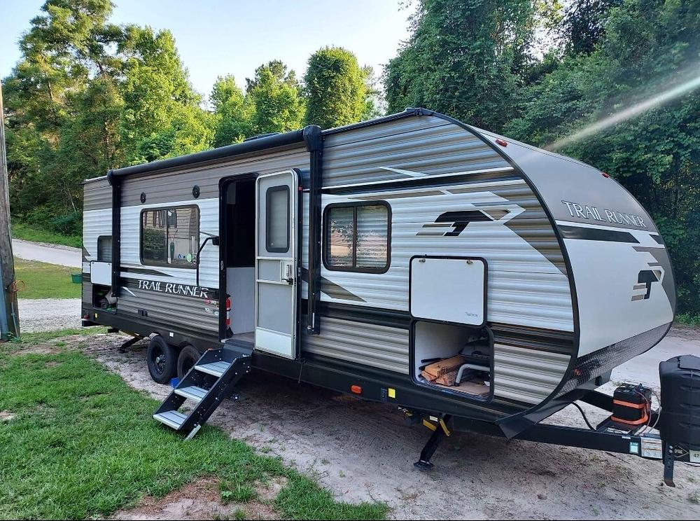The rooftop HVAC was warranty replaced in May 2023. It has wifi capabilities and an indoor/outdoor stereo system. The camper features a queen bed in front, a couch in the middle that lays flat for additional sleeping and bunks in the back left. Lots of storage inside and under. It has blue LED lights underneath the door side and white LED lights above the door under the awning. Speaking of the awning, it is electric powered, as is the jackstand and two underbody stabilizers.