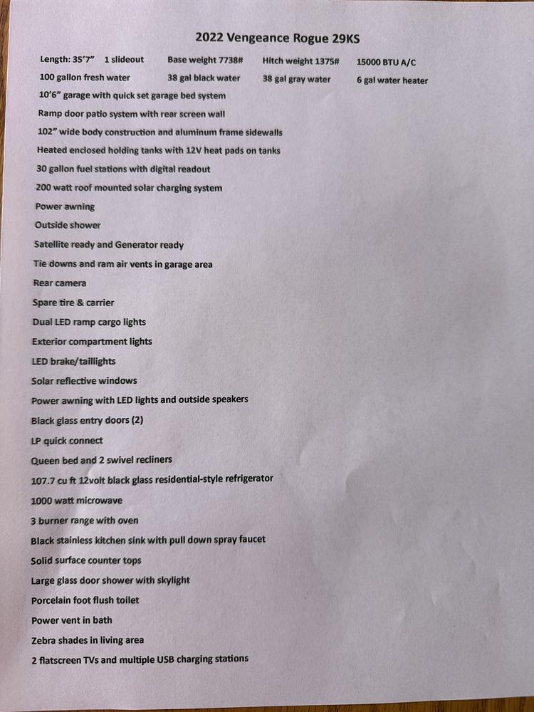 35’7” length. Garage is 10’6” and has quick set bed system. Ramp door patio system with rear screen wall. 100 gal fresh water. 30 gal fuel station. Great condition. See first picture for more specs and features.