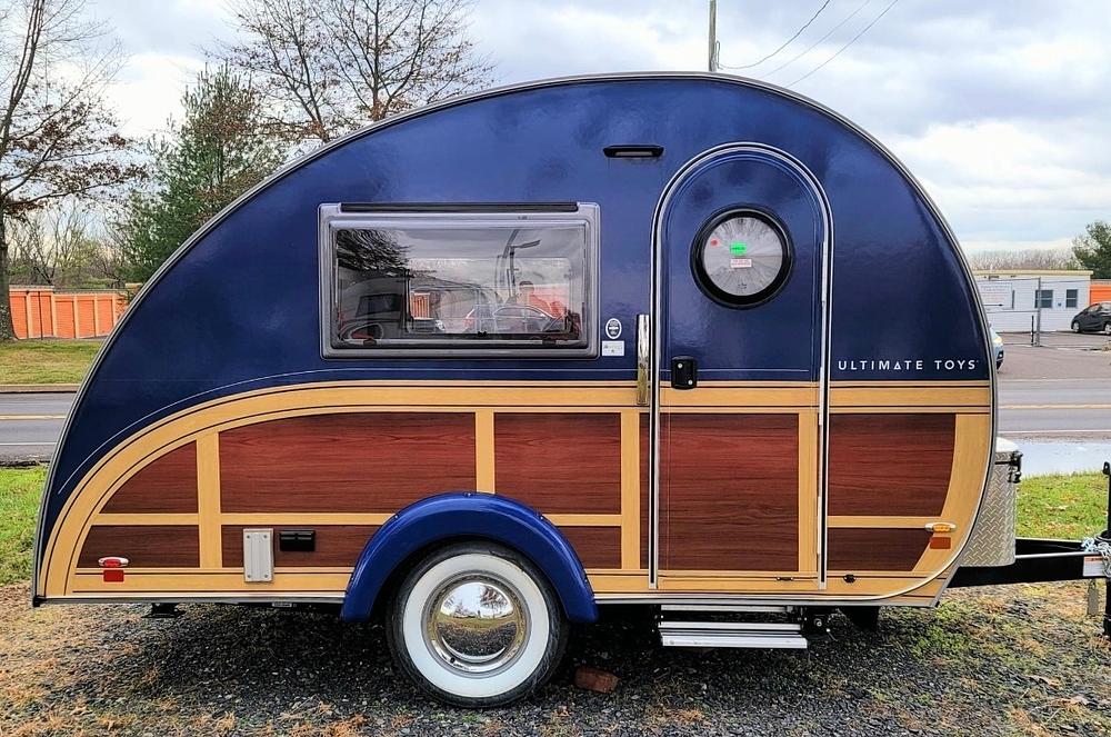 Retro NuCamp for sale. Like new 2022 Ultimate Toy Camper. Towing wt is 2200lbs. Everything you want and need in a teardrop camper with all the amenities of a larger trailer. Two kitchens(one indoor/one outdoor with grill), microwave; LED TVs, dual zone media center with Bluetooth capability, HDMI & USB inputs; dinette converts to queen size bed; dinette table with swivel bracket; LED lighting includes wall, sconces, flush mount ceiling, and undercabinet lights ; Custom wood cabinetry with soft close; under counter refrigerator with freezer compartment; wet bath design that includes shower, sink, and commode; additional outdoor shower; matching awning .
