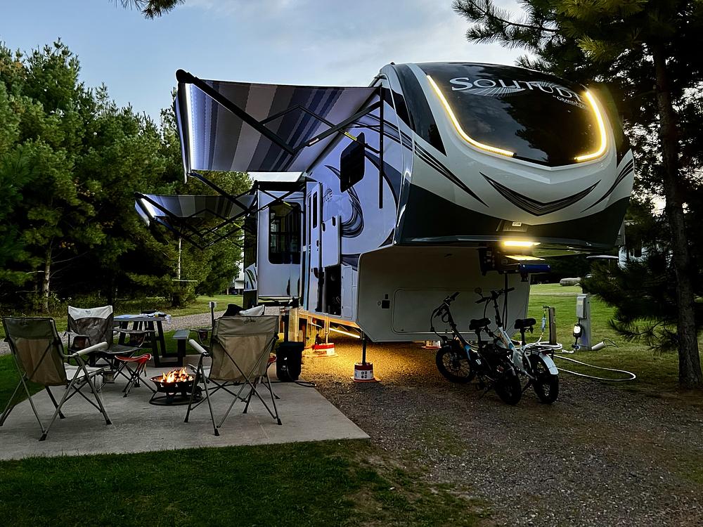 On the exterior, the Grand Design Solitude boasts a sturdy frame and aerodynamic design for smooth towing. Two large awnings provide shade on sunny days. The basement is very large with plenty of storage.