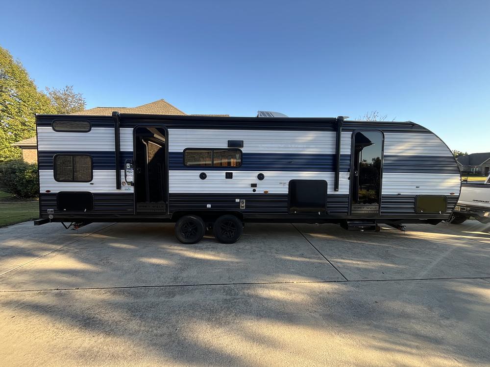 Well-maintained 2023 Forest River Grey Wolf 27DBH travel trailer in great condition. This is a spacious family-friendly bunkhouse model that comfortably sleeps 8-10, featuring double rear bunks, a private front queen bedroom, and a convertible dinette and sofa.