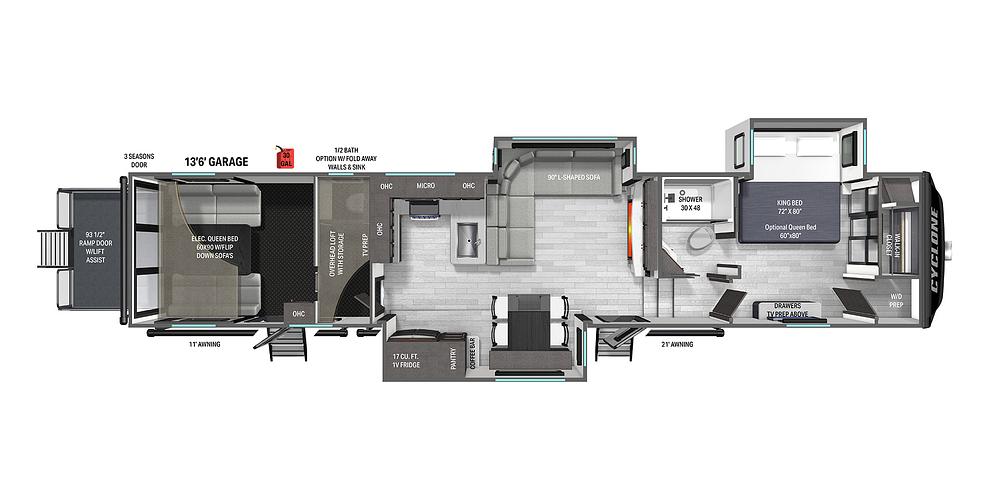 For the adventure-seekers, the Heartland Cyclone 3913 is equipped with features designed for thrill and convenience. With ample garage space, it’s ready to haul your ATV, motorcycles, or other equipment, ensuring that your adventures aren't limited by the confines of the RV. Advanced climate controls and superior insulation promise comfort in any weather, while the state-of-the-art control systems facilitate effortless management of all RV functionalities. Whether you’re parked at a favorite desert vista or nestled within woodland serenity, the Cyclone 3913 transforms every trip into a memorable event, blending the comforts of home with the exhilaration of discovery. Embrace the future of travel with this extraordinary fifth-wheel masterpiece.