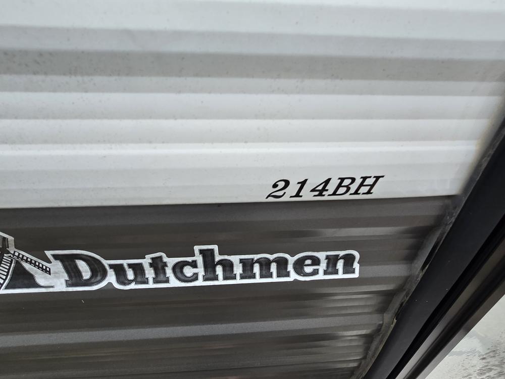 The Dutchmen Coleman 214BH features a spacious interior layout that includes a cozy sleeping area with a queen-size bed, bunk beds, a dinette that converts into an additional sleeping space, and a fully equipped kitchen with a refrigerator, stovetop, microwave, and sink. The bathroom is equipped with a toilet, sink, and shower, providing all the comforts of home while on the go.