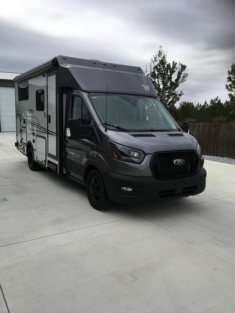 2024 Winnebago EKKO 22A. This unit on a Ford Transit comes with 455W of solar panels, 2 TVs, a 3000W inverter, Truma tankless water heater, (1) 310 AMP lithium battery and a 2880W gas, Onan generator with 84 hours. Both cab seats swivel, the fresh water capacity is 51 gal, grey water 51 gal, and (2) 5 gallon cassettes for the toilet. The AC was upgraded to a 15000 BTU, 2 speed. One outside storage holds a Dometic fridge/freezer, sitting on a custom slide. The unit is stored in a conditioned garage.