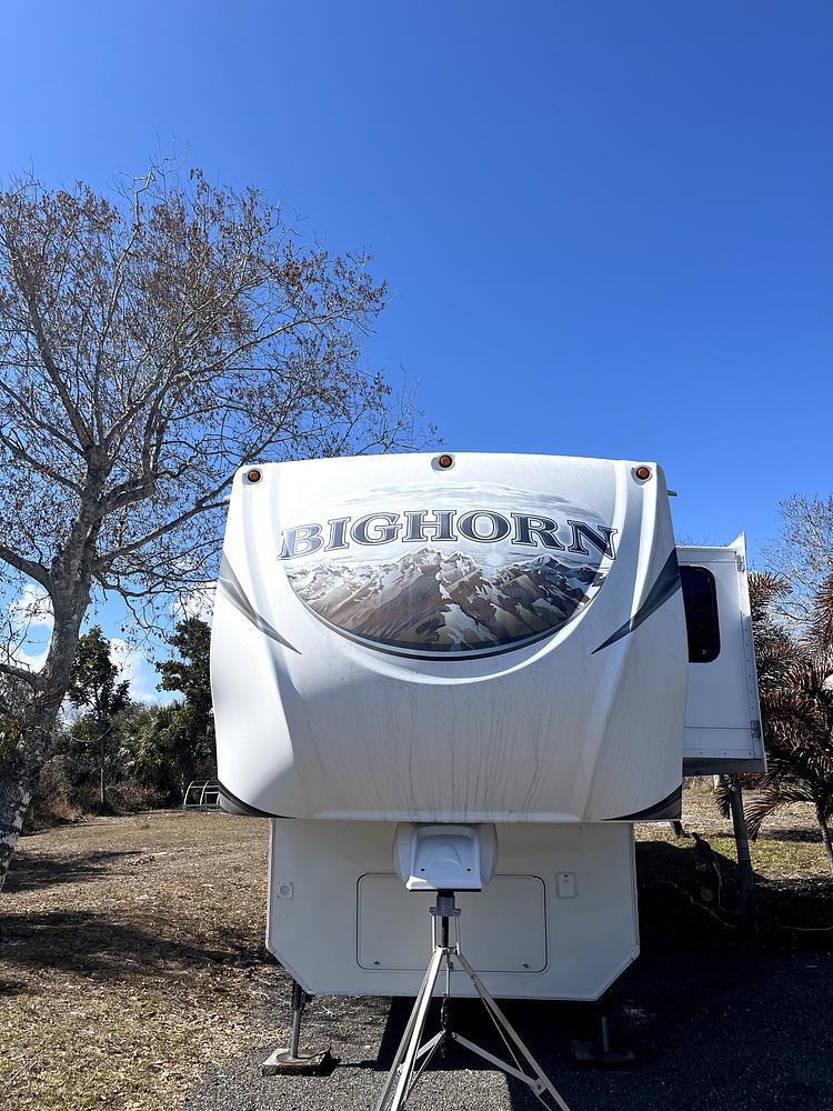 Beautiful premium Bighorn Fifth-Wheel trailer, parked and impeccably maintained with minimal use by owners while permanent home was being built. King-sized bed, two new love seats, massive storage, solid surface countertops known for their durability and water resistance, high quality vinyl flooring, central vacuum system, high gloss gel-coated fiberglass exterior, vacuum-bonded laminated construction, aluminum cage-frame within walls, fully-insulated for four season use. Two air conditioners, heat, and fan only settings. Very functional Kitchen with large 12 cubic foot, 4-door design refrigerator with RV absorption freezer that runs on propane or electricity. Stainless steel kitchen sink.. Four-burner stove (never used) & oven. Large microwave/convention oven. Full-size shower & ceramic sink in bathroom. Good-size closet space in bedroom, including washer/dryer hookup. TV's in living area and bedroom. Electric fireplace in living area. Four person dining table and chairs. All in excellent condition.