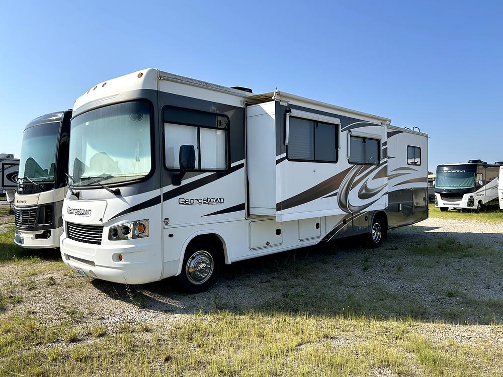 This Forest River Georgetown 351DS is a Class A motorhome that offers the perfect combination of luxury and functionality. With only 18,410 miles on the odometer, this RV is practically brand new and ready to hit the open road. The Georgetown is known for its spacious interior, featuring two large slide-outs that provide ample living space for you and your family.