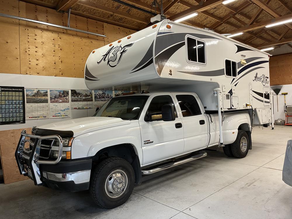 This one has it all; solar, generator, full wall slide, microwave, winegard antennae and 17 tv and awning off the back. Air conditioned and has always been covered or inside shop. Everything works well. Low miles, used less than 14 days a year. Add-ons include taller ceramic toilet, full memory foam mattress and Arctic Fox porch for easier entrance. Also available is the 2006 Chevy Silverado 3500 dually with only 128,000 miles. Truck has fifth wheel in bed and airbags with individual controls. Duramax diesel and Allison transmission.