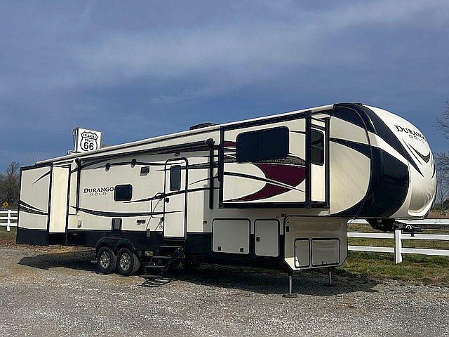 Explore our 2016 KZ Durango Gold G380FLF, a luxurious 41' double axle fifth wheel with five slide-outs and a weight of 12,120 lbs. The trailer is equipped with a 57 gal. fresh water, 57 gal. gray water, and a 57 gal. black. This spacious RV sleeps 6 comfortably, featuring a king bed and hide-a-bed sofas. Enjoy the comforts of home with 50 Amp power, air conditioning, 35k BTU heater, and a cozy fireplace. The bathroom features include a glass door shower, plenty of storage and a porcelain commode. The kitchen is equipped with a 3-burner stove, oven, microwave, and 2-way refrigerator. Additional amenities include two TVs, AM/FM/CD stereo, and outdoor shower. This self-contained RV boasts ample storage, an Onan 5.5kW LP generator and an automatic auto leveling system.