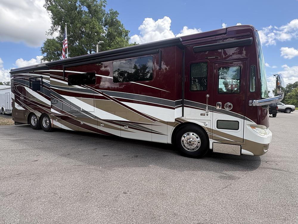 Beautifully kept with low mileage (31,424 miles), this coach was special built with virtually every option available in 2017. The 45 ft, tag axle model 45OP was the most popular floorplan with a King size bed, Hugh rear bath and walk in closet behind the bathroom for the stacked washer/dryer and additional storage. New tires in late 2023, only 672 hours on the generator, aqua hot heating, heated floors, polished custom layed tile throughout. Very well maintained.