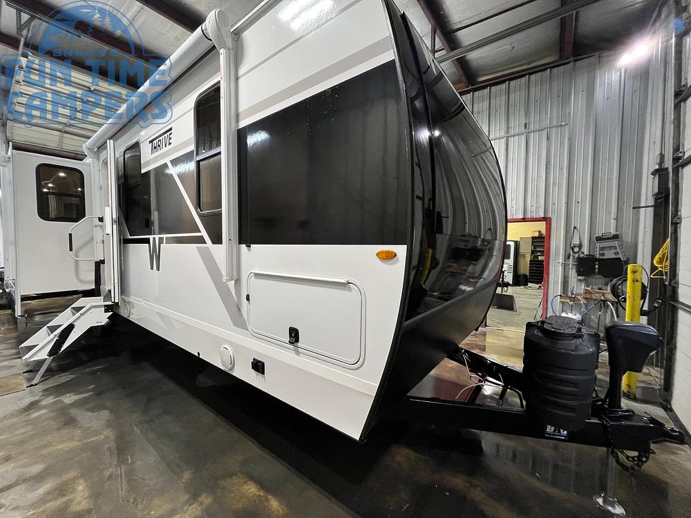 From long weekends to full-season escapes, the Thrive 29RLO delivers high-end livability and modern style in a spacious, dual-slide layout. The front bedroom includes an Olympic queen bed, washer/dryer prep, and a panoramic window for scenic views.