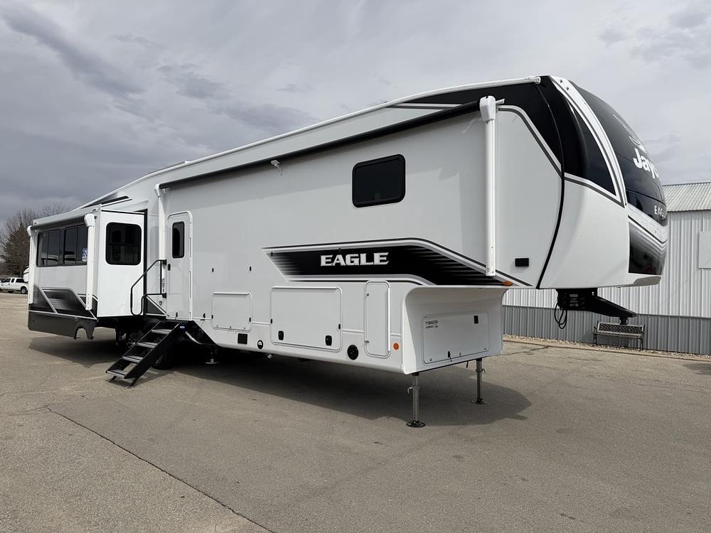 With any Eagle fifth wheel by Jayco you will appreciate durable construction materials, like the Magnum Truss Roof and the Stronghold VBL laminated walls. The JAYCOMMAND Smart RV system puts you in control of your RV's functions, and the 4 Star Handling Package will provide smooth towing from home to camp. Each model features Climate Shield zero-degree tested weather protection and the industry-exclusive HELIX cooling system that features two 15,000 BTU Whisper Quiet A/C's to keep you comfortable during those colder months. Some of the exterior conveniences you are sure to love are the pass-through storage with Slam-Latch baggage doors and an automotive style front cap with max turn radius. The Eagle fifth wheels are designed to make you feel at home with solid surface countertops, residential vinyl flooring throughout, 100% no floor vents, and blackout roller shades with reflective side throughout for added privacy and insulation.