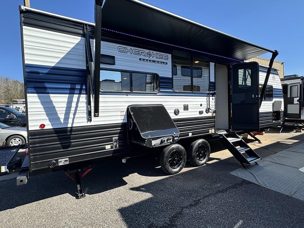 This Cherokee Grey Wolf 26SS has a beautiful rear kitchen with a living area in the middle. The highlights include a fireplace with a hidden pantry behind it. The sofa is directly across from the fireplace and entertainment center, making a comfortable and spacious living area. The dinette converts to additional sleeping if you want to bring a guest along! The rear kitchen is perfect for a chef-on-the-go! It has lots of counter space and storage so that you can still make amazing meals in your camper! Another big highlight is the front bedroom with its king size bed! This camper also has an outdoor kitchen and lots of outdoor storage!