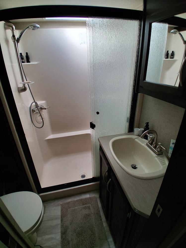 37 ft long. 12 cubic ft. Double door refrigerator.Four burner stove with oven. Solid wood kitchen table with leaf and four chairs. Pantry, center island with more cupboard space then mist campers. LED lights throughout with solar collector on roof to recharge batteries that were replaced in Dec. 2925. Living room has two recliners with a large hideway couch that makes into a double bed. Electruc fireplace. Bath has a one piece fiberglass shower with built in seat and glass doors. Porcelan toilet and linen closet. Bedroom has King bed with storage underneath. Large clothes closet and ceiling to floor