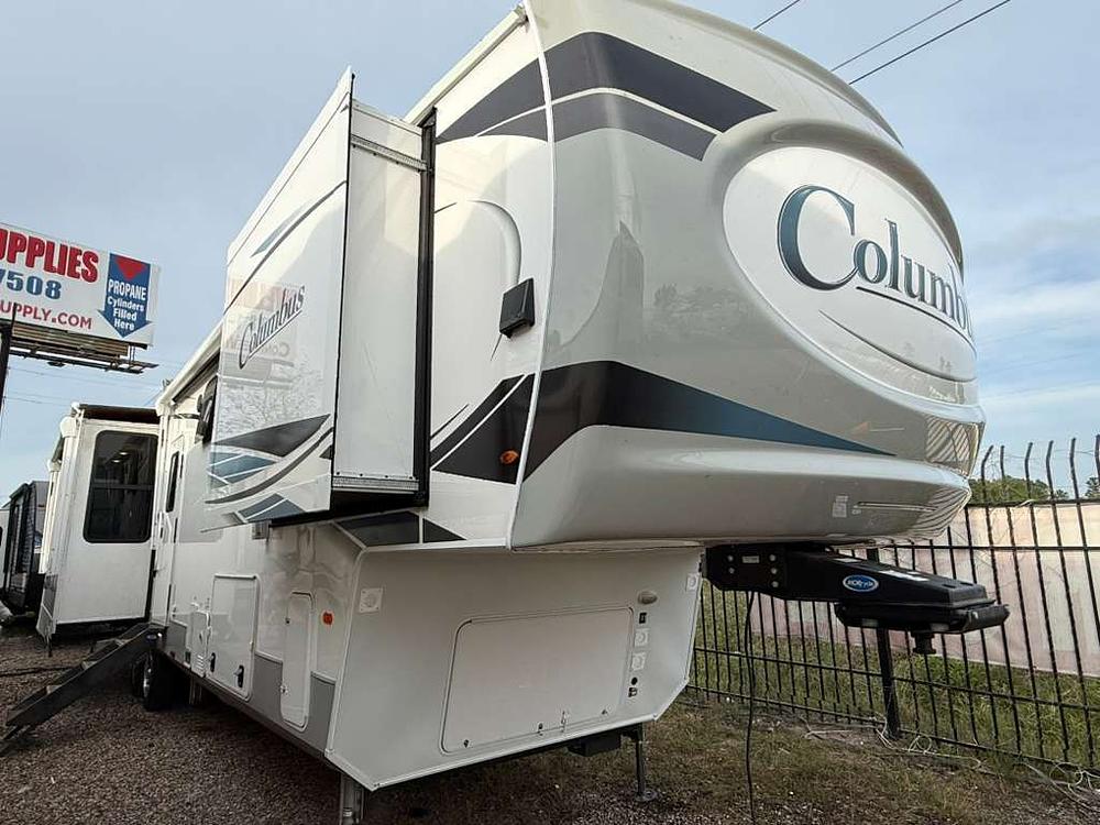 The Columbus 382FB delivers top-tier luxury with a front bath, dual sinks, walk-in closet, and washer/dryer—ideal for full-time RV living.