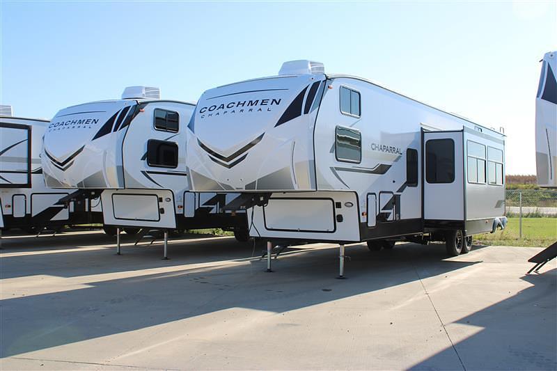 2026 Coachmen Chaparral 375BAF with front bunk room! 4 bunks in the front of the camper along with a full bath with shower, washer/dryer prep and storage space! Mid living area has a tri fold sofa that folds out into a bed, theater seating facing an entertainment center with fireplace and TV. Mid kitchen area has an island with sink, table and chairs, 4 burner stove, oven, microwave and refrigerator. Master has a king bed in the slide, loft above with access from the kitchen, double vanity full bath with shower and plenty of storage space throughout! Secure stance steps, 3 ACs, electric awning, solar panel system, and 4 point auto level. BEAUTIFUL unit - stop by and check it out!!