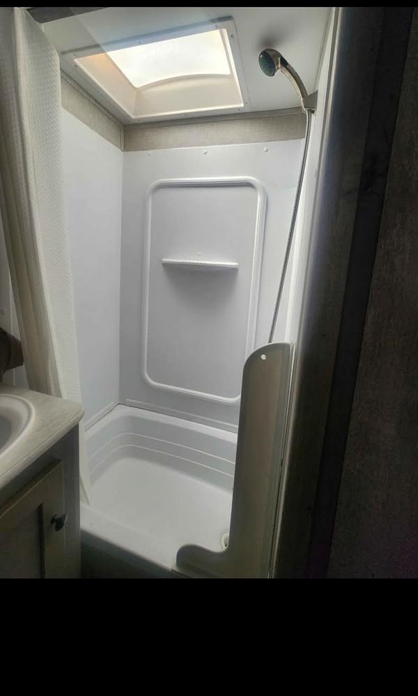 Inside, you'll find a cozy living area with comfortable seating, a dining table, and a fully-equipped kitchen complete with modern appliances and ample counter space. The bedroom features a queen-sized bed and plenty of storage for all your belongings. The bathroom is spacious and includes a shower, sink, and toilet.