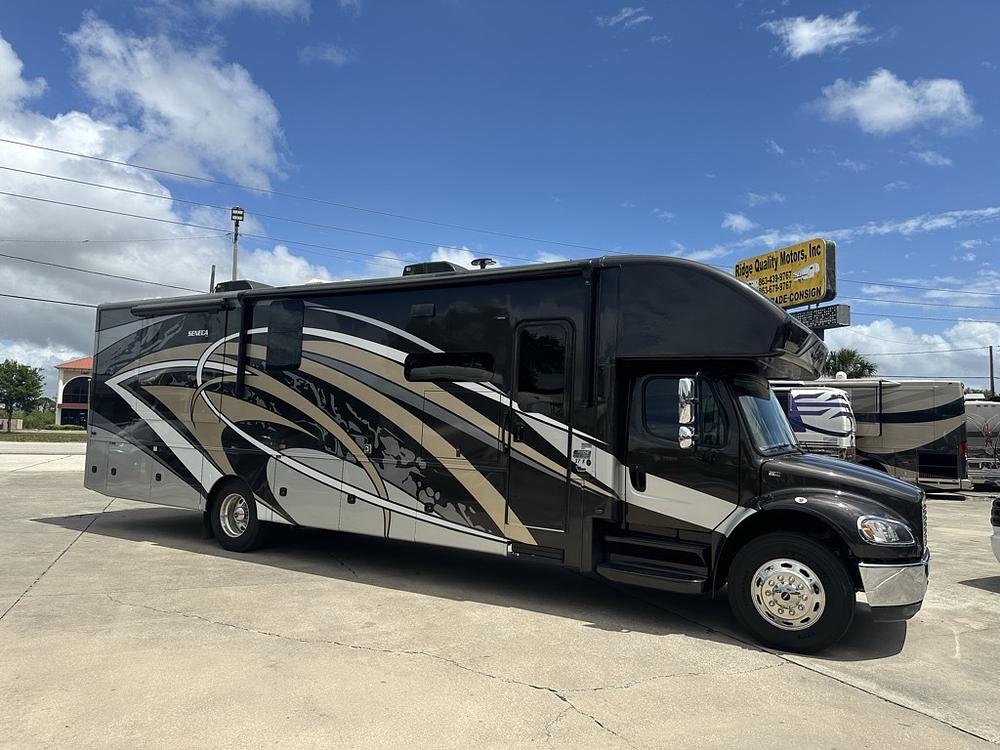 Up for sale is an extremely clean 2021 Jayco Seneca 37K featuring the desirable BATH + ½ FLOORPLAN. This unit is 39'4\' with two slide outs. Sitting on the Freightliner Super C chassis and powered by the 360 Cummins with only 23k miles. Some features include a power patio awning, slide topper awnings, two a/c units, frameless glass windows, exterior tv, onan 8000 generator, automatic gen start, power cord reel, sleeping for six, hydraulic auto leveling, full body paint, roller shades, electric fireplace, pass though storage, vinyl floors throughout, three burner cooktop, convection microwave, residential fridge with ice-maker, washer/dryer prepped, walk around king bed, back/side cameras, weather tech floor mats, custom center console, overhead bunk bed, xantrex inverter, large pantry, corian counters, tankless water heater, front cab shades, tire minder system, alcoa wheels and a fiberglass roof. This unit has been garage kept and is extremely clean inside and out.