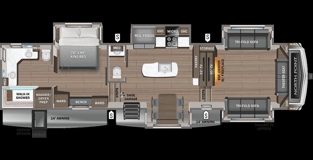 At 38 feet in length, the North Point 382FLRB offers plenty of space for you and your family to relax and unwind. The front living room layout features a spacious entertainment center, comfortable seating, and large windows that let in plenty of natural light. The kitchen is equipped with modern appliances, solid surface countertops, and ample storage space for all of your cooking essentials.