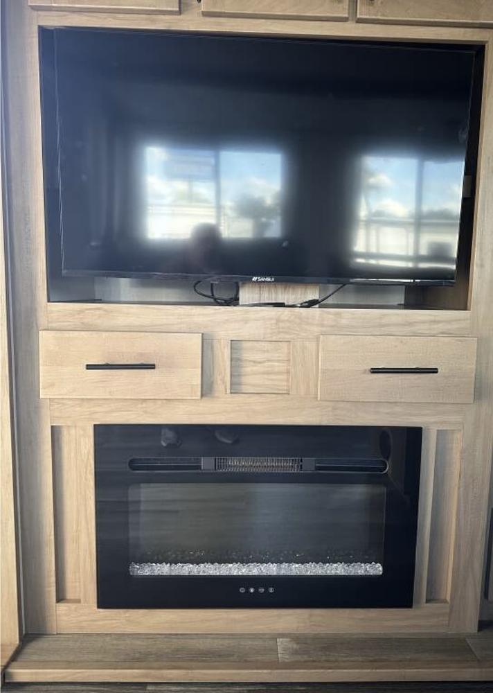 The 2023 Forest River Sabre 38DBQ is a 42' 7" fifth wheel bunkhouse designed for large families, featuring two full bathrooms, four slides, and sleeping capacity for up to at least 6 people. Key highlights include a rear bunkhouse with a loft, a private front king bedroom, an outdoor kitchen, and a residential-style interior with a kitchen island and dual-fridge setup. is a luxurious fifth wheel trailer that offers the perfect combination of style, comfort, and functionality for all your camping adventures. With its sleek design and modern features, this vehicle is sure to turn heads wherever you go. The spacious interior is beautifully designed with high-quality materials and finishes, creating a welcoming and cozy atmosphere for you and your family to enjoy. Whether you're relaxing in the living area, cooking a meal in the fully-equipped kitchen, or getting a good night's sleep in the comfortable bedroom, you'll feel right at home in this RV. The Forest River Sabre also offers plenty of storage space for all your belongings, so you can bring along everything you need for a memorable trip. With its durable construction and top-of-the-line amenities, this fifth wheel trailer is built to last and will provide you with years of enjoyment on the road. Don't miss out on the opportunity to experience the ultimate in luxury camping with the 2023 Forest River Sabre.
