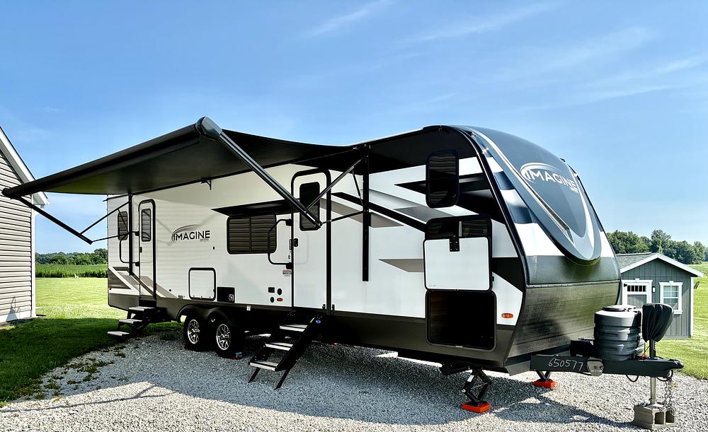This Grand Design Imagine 2920 BS is used, however; it shows like new. The length is 34.5 ft., width is 8 ft. (with slideout 13 ft.) and height is 11.25 ft. Dry Weight is 7,523 lbs., GVWR is 8,995 lbs and hitch weight is 828 lbs. We currently pull this travel trailer with ease using our Chevy Silverado 1500 Pick-up truck. There are two slide outs, one in living area and one in main bedroom. On the exterior is a 21 awning, exterior storage, outdoor griddle and solar panel on the roof. It has enclosed underbody for four season use. Fresh water tank capacity is 52 gal., gray tank capacity 90 gal. and black water tank capacity 45 gal. Furnace is 30,000 btu and a/c 15,000 btu.