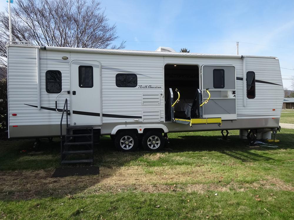 Handicap Accessible, custom built with open floor plan, Queen size hospital bed with independent operating sides in the roll out slide, Wheelchair lift into the side with BIG door, handicap accessible shower and toilet, roll away table, wall desk, refrigerator, microwave, oven, REAL NICE CONDITION, NOT Towed much over the years. ball hitch and sway bars are included. Many more pictures are available.