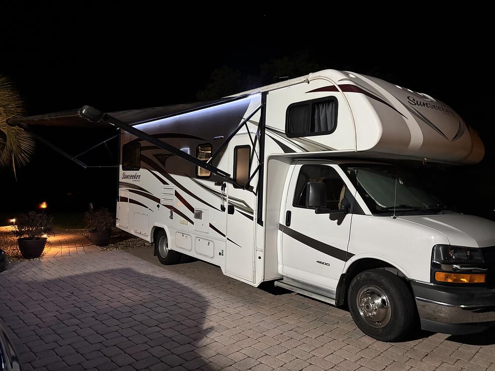 Large shade awning w/ outdoor speakers and LED lighting, as well as awnings for the slide outs.