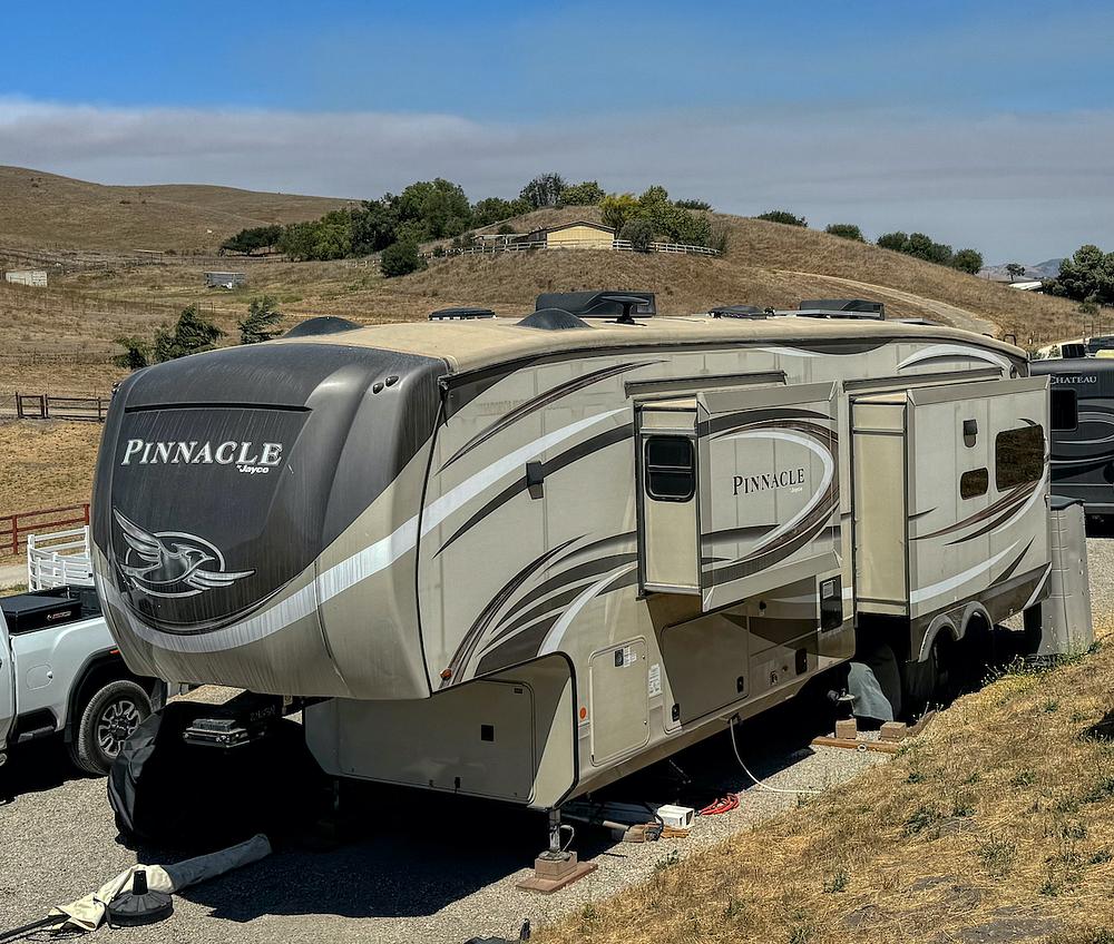 The exterior of the Jayco Pinnacle is just as impressive, with a sleek design and high-quality construction that stands out on the road. With features such as electric stabilizer jacks, Blue tooth propane level sensor, plenty of basement storage, water shutoff valves, heavy duty bumper and 2 large awnings with Carefree Vista awning screens, this RV is ready for adventure wherever you go.