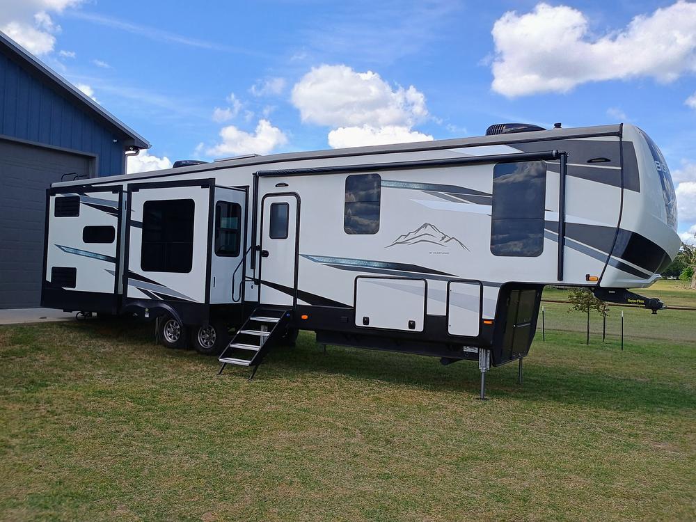 Like New and still smells New 2022 Heartland Big Country 3703RK fifth wheel with high-quality amenities, 2 ACs, and 4 slides creating a spacious and comfortable interior perfect for long trips or full-time living. This fifth wheel has been stored in an air-conditioned garage since bought new (I am original owner and it has been used very little, pulled approximately 2500 miles).