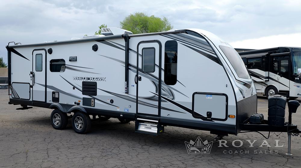Outside, the 2022 White Hawk 27RB offers dual entry doors, a power awning with LED lighting, pass-through storage, and an optional outdoor kitchen, making it ideal for both campsite living and entertaining.