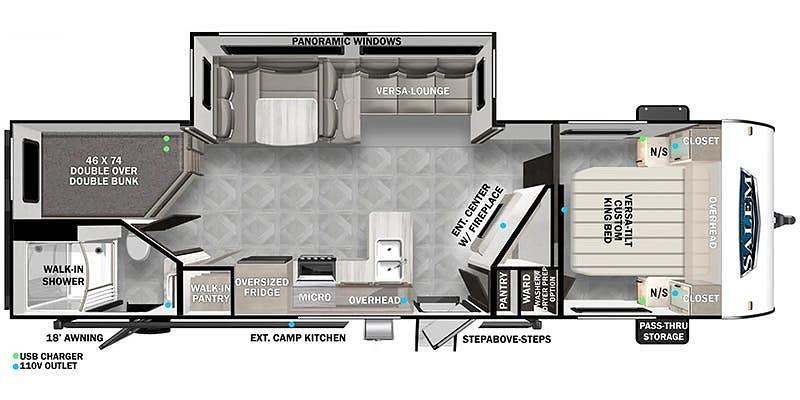 Inside, you'll find a fully equipped kitchen with high-end appliances, a comfortable living area with plush seating, and a cozy bedroom with plenty of storage space. The bathroom is designed for convenience, with a spacious shower and a toilet that is easy to use. The Salem Platinum also features a high-tech entertainment system, including a flat-screen TV and a premium sound system.