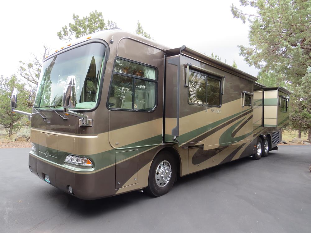 2004 Monaco Dynasty 40 Regent, 2 slide outs with topper awnings, window awnings, ONE Original owner bought new and has been kept in a heated shop. Full Body paint recently waxed, Roadmaster 10 air bag chassis with tag, 400 Cummins 8.9 Liter diesel , 101383 miles, new Alcoa wheels in 2018 , rebuilt Aqua Hot in 2024, 2 stage jake brake, 18 foot Girard electric awning with wind sensor, 7.5 onan quiet diesel gen 599 hours, new house batteries in 2025, 2 slide out trays in basement, 3m clear mask on front cap, one piece windshield ,brand new LED headlights, interior ceiling lights updated to LED, solid Maple wood cabinets through- out, new Samsung smart tv, sleep number air mattress, 4 door lp/ 110 refer with ice maker, convection microwave, combo washer dryer, newer Alpine stereo with Bluetooth.