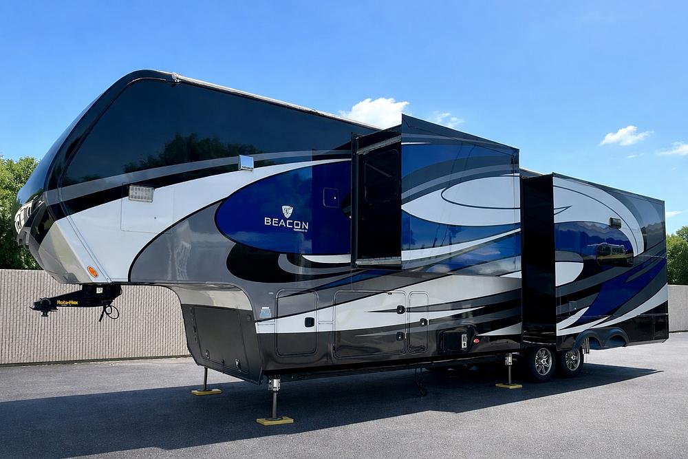This 2019 Vanleigh Beacon 39GBB is a great Fifth Wheel for long stays or traveling. In addition to it's long list of Factory equipment and options, it has ben upgraded with 975 Watts of SOLAR POWER to include 5 Battle Born Lithium Ion Batteries, a Victron Energy MultiPlus 3000 watt Inverter/Charger, and a Victron Energy MPPT 150 Smart Solar Charge Controller. This example is appointed with the Amber Glaze Cabinetry on the inside and the Waterfall Full Body Paint Scheme on the outside. The 39GBB Model has 4 slide outs, is 38'11" Long and has a Dry Weight of 14,600 Lbs. This floorplan features a rear lounge that includes a theater seat reclining loveseat and a large tri-fold sleeper sofa that face an entertainment center that features a large flat screen TV and an electric fireplace. The kitchen features a large island with a stainless steel farmhouse sink, a built in 3 burner cooktop, a built in oven, an over the range residential microwave oven, and a large Whirlpool French Door Fridge with Ice and Water in the door. The 39GBB also features the Grand Bar Buffet that has tons of counter space for small appliances or food prep, along with lots more cabinetry and even a Built in Wine Chiller! The bedroom features a Brand New King Bed, plenty more cabinetry, and a TV. The front master bathroom features a double sink vanity, a large glass enclosed shower, a large wardrobe closet, and a Splendide stacker washer and dryer. For more info on this Fifth wheel you can call or text Brian at 863-651-9365 or just respond to this ad.