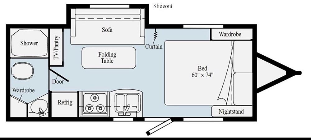 The bedroom features a queen-size bed with overhead storage and bedside tables for added convenience. The bathroom is spacious and includes a shower, toilet, and sink.