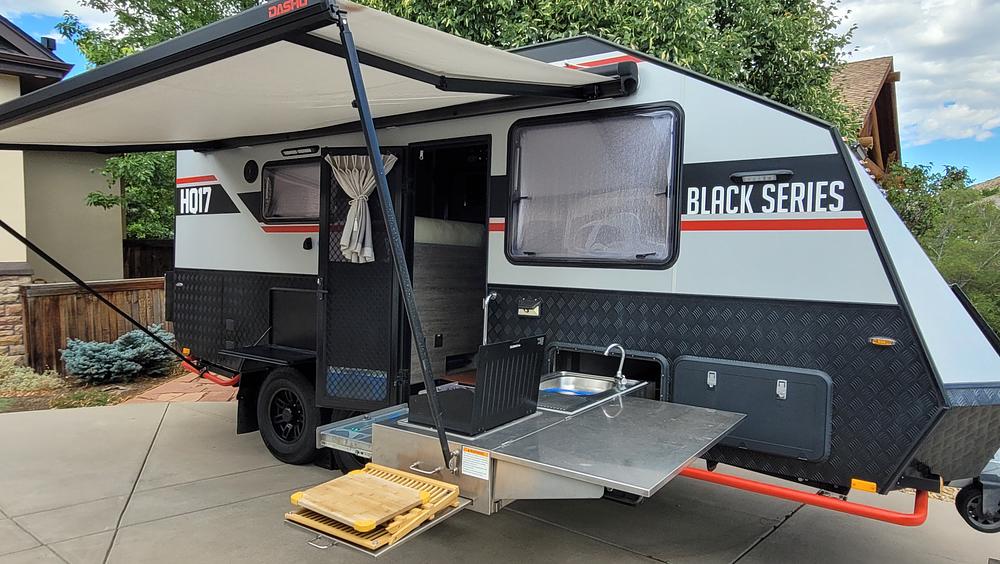 Exterior: Eurovision windows with fly screens and privacy shades, roof hatch with shade. Full roof and wall R16 foam insulation. The entrance step is electric, telescoping. Electric awning with remote control. The outdoor slide out kitchen has a sink, 2 burner stove with plenty of storage drawers. The fold down prep bench has a cigarette lighter style DC plug and 110 V AC outlet. There is LED lighting on all four sides with additional solar powered lights with motion sensors on both sides. The security door has a screen door built-in. There is an exterior shower with hot/cold water.