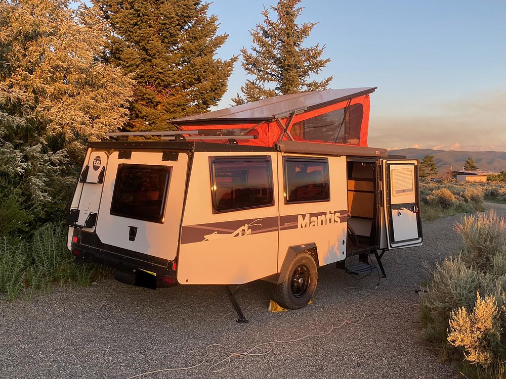 The Taxa Mantis is a 19-foot long, lightweight, and versatile adventure trailer designed for off-grid camping, comfortably sleeping four adults with the option to add more sleeping space with a rooftop tent. It features a pop-up roof for increased headroom and ventilation, a modular interior, and a functional kitchen and bathroom. Inspired by NASA design, it's known for its efficient use of space, durable construction, and ability to fit in a standard garage.