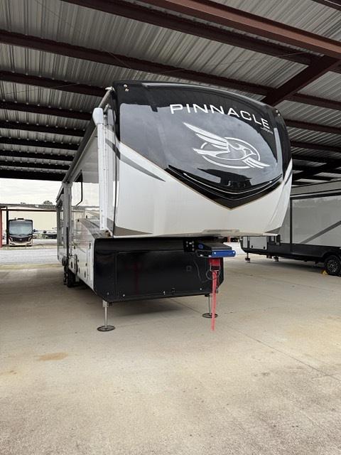 The exterior of the Pinnacle boasts a sleek and aerodynamic design, making it easy to tow and maneuver. The large windows offer panoramic views of your surroundings, allowing you to truly immerse yourself in the beauty of nature. Whether you're traveling solo or with a group, this fifth wheel can accommodate all your needs.
