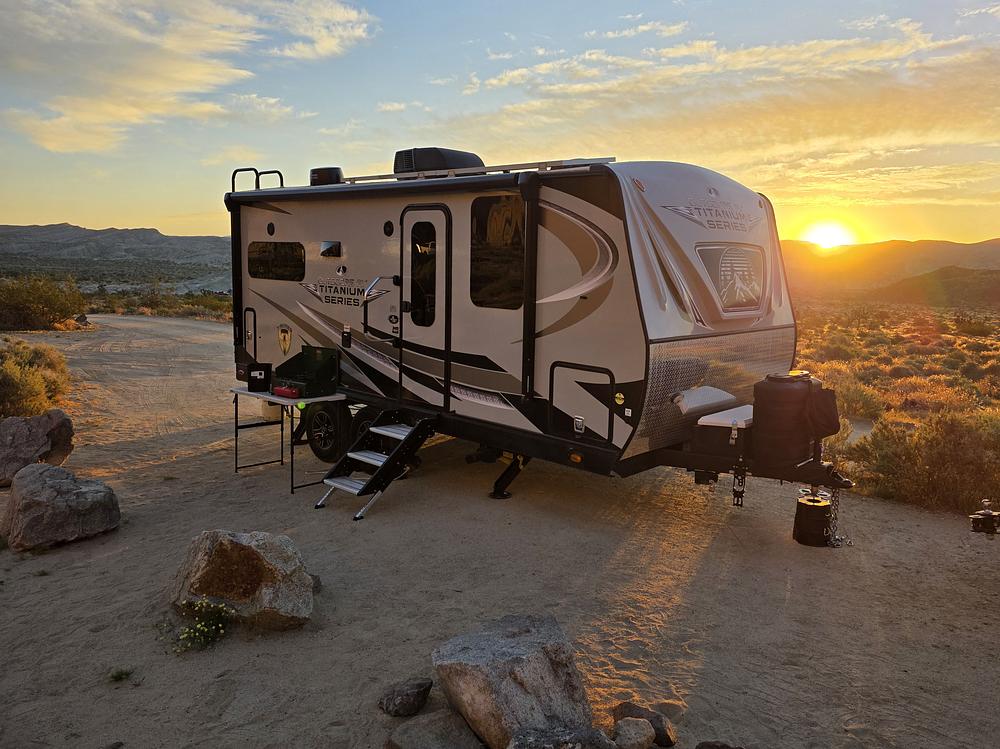 It is a four-season travel trailer built for serious off-grid camping and rougher backroads. Outdoors RV trailers are known for their rugged construction and superior insulation, making them perfect for desert, mountain, or cold-weather camping. One of the best features of the TITANIUM package is the Automatic Leveling System where you literally push a button and the system levels the trailer.