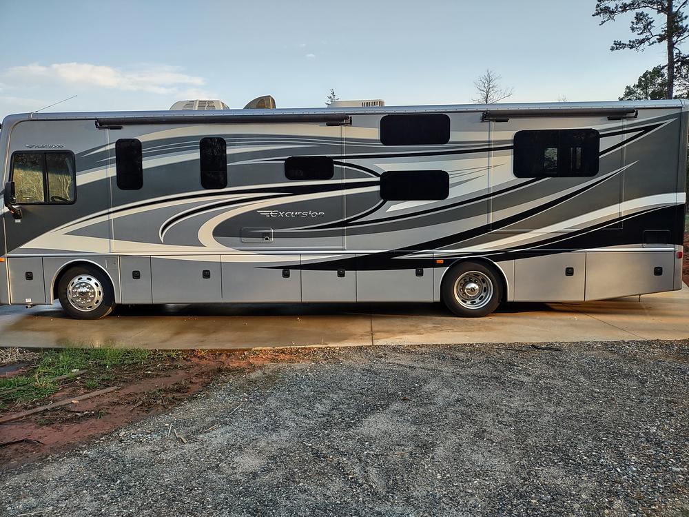 2015 Fleetwood Excursion 35e Bunkhouse floor plan. Stored Indoors. 40,135 miles. Freightliner XC chassis with Cummins ISB 6.7L Diesel (300 HP / 660 lb-ft) GVWR- 26,000 Allison 6-speed automatic transmission. Automatic 4-point hydraulic leveling. 6000watt Onan Quiet Diesel generator. 22.5 aluminum wheels. Frameless flush-mount windows. Abundant pass-through exterior storage. Dual A/C units plus powerful furnace. 90-gallon fuel tank for long-range travel. 77-gal fresh water / 60-gal gray / 32-gal black water tanks. New Tires installed 2022. Hide-A-Loft drop-down queen bed. Outdoor Entertainment Center. Washer/Dryer Hookups ready for an onboard laundry unit. Residential Refrigerator with 2000 watt inverter. Central Vacuum. Convection Microwave Oven. Sony 5.1 Home Theater System with built-in AM/FM/DVD and surround sound speakers true theater experience.