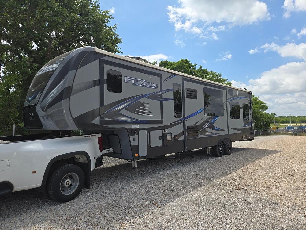 2017 Keystone Fuzion 369 toy hauler in great condition. Single bathroom floorplan with a clean, open 12 garageperfect for hauling toys, storage, or converting into a custom bunkroom or living space.