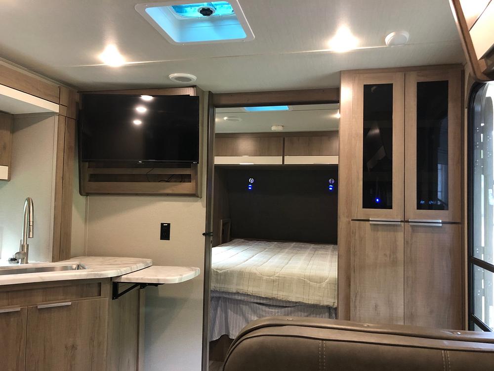 The master bedroom includes a queen-size bed with upgraded mattress, overhead storage and side wardrobes for clothing. The bathroom features a spacious shower, toilet, and sink, making it easy to freshen up on the go. With its thoughtful design and attention to detail, the Grand Design Imagine XLS offers a level of comfort and luxury usually reserved for high-end RVs.