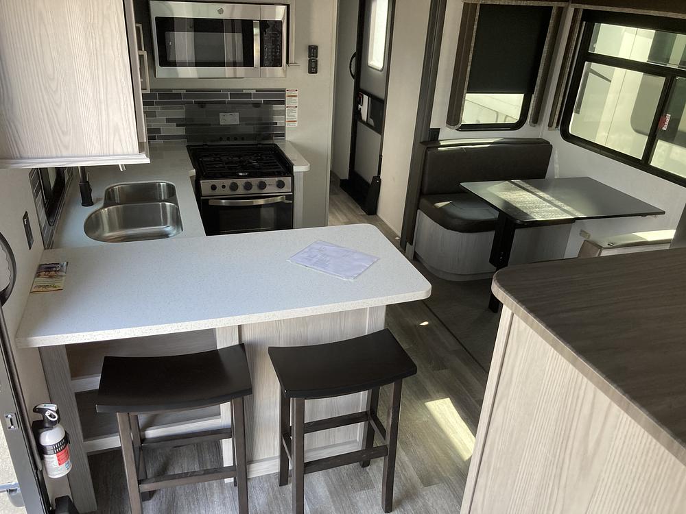 As you step inside, you'll be greeted by a spacious and well-appointed living area with plenty of seating for family and friends. The kitchen is equipped with modern appliances and ample counter space, making it easy to whip up delicious meals on the road. The bedroom features a comfortable bed and plenty of storage for all of your belongings.
