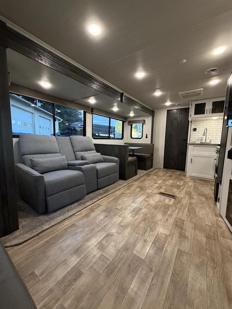 Rear living models are one of the most comfortable layouts you can getbig windows, more seating, and a much more open feel. This one is fully equipped and ready to camp today with solar, upgraded seating, outdoor entertainment, and hitch included.