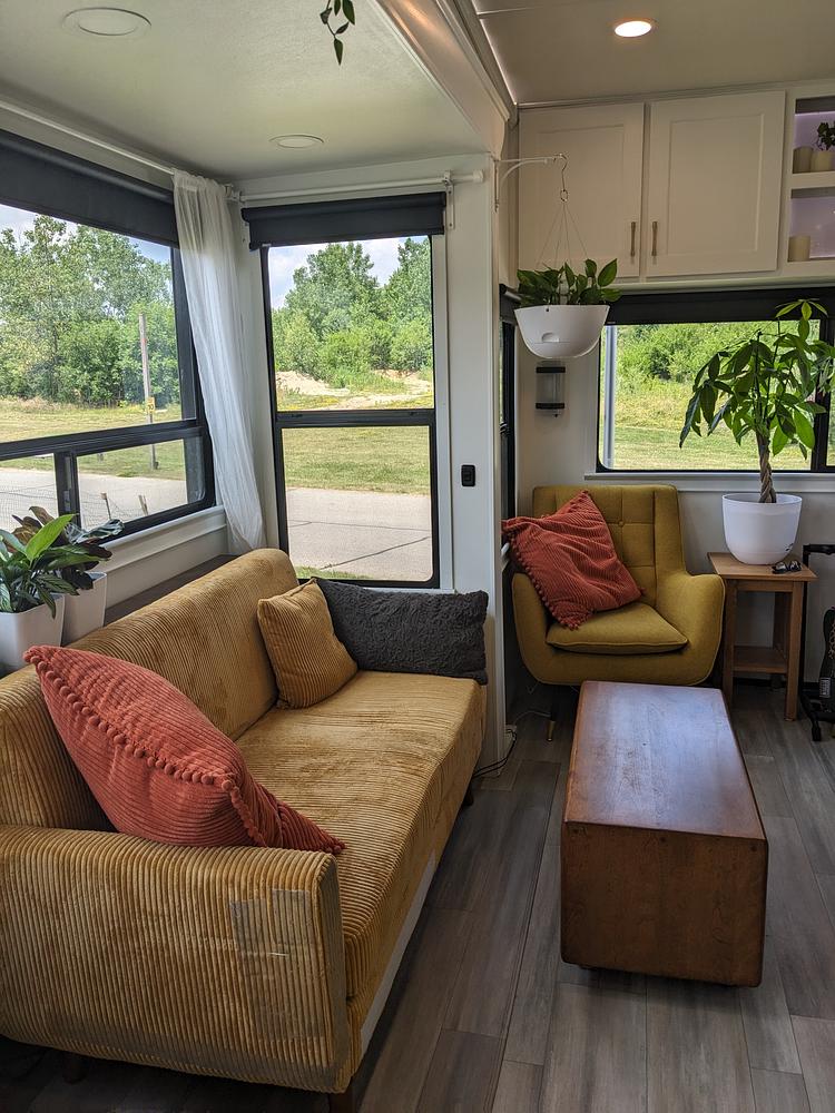My husband and I love this RV, but were moving overseas and must sell. The RV was purchased in 2024 and we immediately renovated it with modern designer updates for full-time living. (It was in perfect condition when we bought it, but I just cant stand ugly brown faux-leather furniture or fake wood).