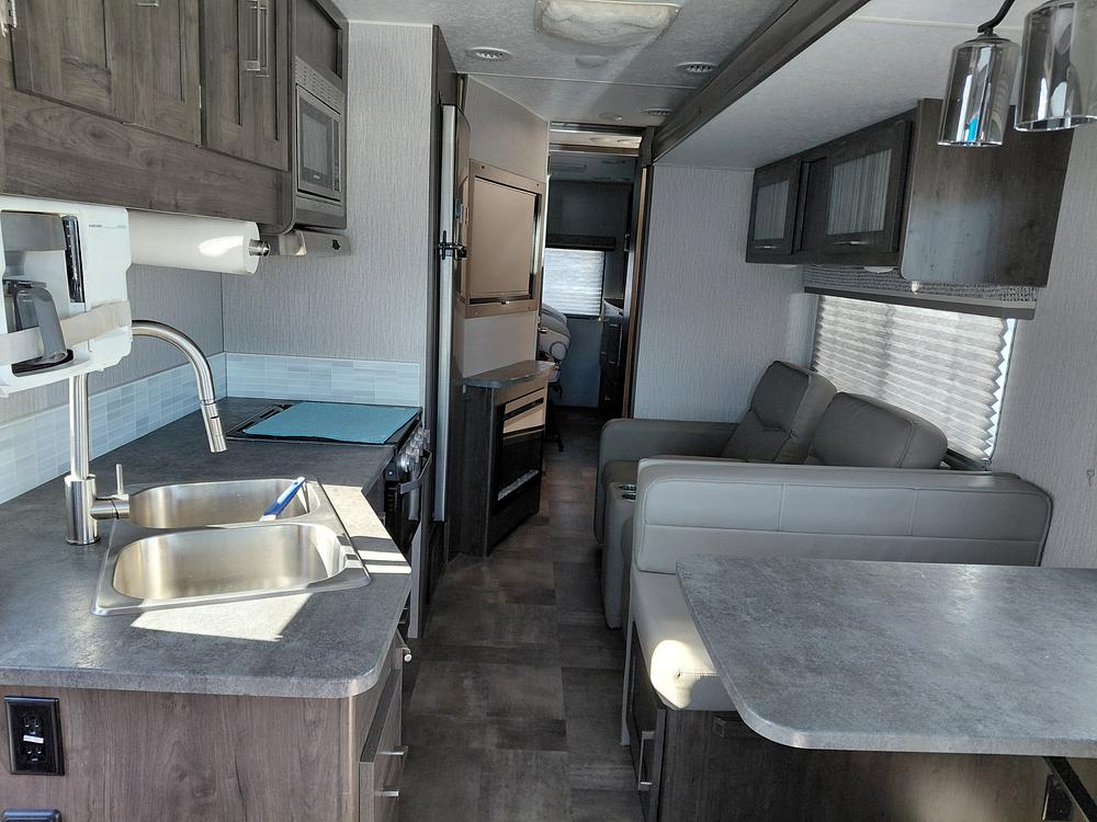 Great condition, easy access to front gas engine, cruise control, rearview camera, 2 side cameras, 2 indoor and 1 outdoor TV's, electric fireplace w/heat blower, outside storage bins, 3 closets, ball bearing drawers, electric awning, microwave, 3 burner stove top and oven, double kitchen sink, kitchen pantry with plenty of room. 2 roof vents, extra storage under the dining table seats that seat 4, 2 reclining chairs that sit in front of the fireplace. Driver and passenger seats turn around to face inside of RV. Queen size master bed, dining table sleeps 2-3, pull down bed over driver/passenger seats with netting. Bedroom has storage over the bed , 3 closets, and 6 drawers. Includes dishes, glasses, cups, silverware, bowls and some pots and pans. Built in coffeemaker, coffee grounds grinder. Pulls a tow car with no issues. CilaJet outside coating keeps the outside looking polished and easy to clean. Flooring makes for easy cleaning. Bathroom toilet and sink are separate from shower. Skylights that open with fans in bathroom and kitchen/living area. Large window in bedroom with side windows on each side of the bed. Window coverings in bedroom and living area. Curtain over front window. Wall slide in living area and slide in bedroom. Pull out desk if front of passenger seat for computer reading, writing. Listing price is negotiable.
